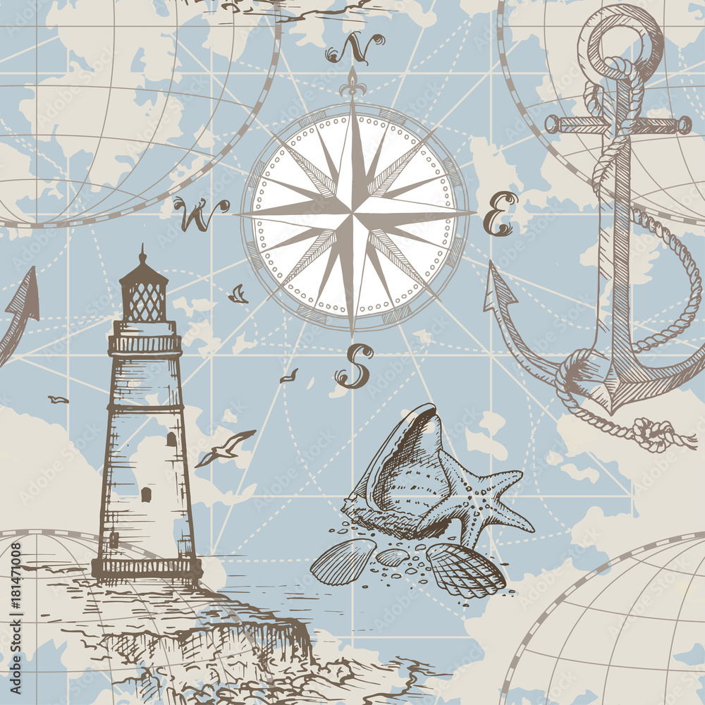 Wall Murals Hand Drawn Vector Seamless Sea Map With Compass